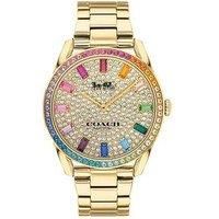 Coach 14503657 is an incredible interesting Ladies watch. Material of the case is Gold Plated Stainless Steel, which stands for a high quality of the item. This model has got 30 metres water resistancy - it can be worn in scenarios where it is likely to be splashed but not immersed in water. It can be worn while washing your hands and will be fine in rain. We ship it with an original box and a guarantee from the manufacturer.