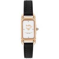 COACH Ladies Cadie Watch Ladies Coach watch from the Cadie family. Featuring a 17.5x28.5mm rose gold case, silver-white satin dial and black leather strap. Case height (in cm): .6 Case Shape: Rectangular Glass: Mineral Movement: Japanese Quartz (battery) Strap Material: Leather Water Resistant: Y