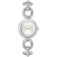 BOSS Live Ladies watch White BOSS ladies three hand watch from the Live family. Featuring a 28mm stainless steel case, silver white dial, finished on a stainless steel circular link bracelet. Water resistant to 3ATM. 24Hr Display: N Case Diameter (in cm): 2.8 Case height (in cm): .8 Case Length (in cm): 2.8 Case Shape: Round Case Width (in cm): 2.8 Fastening Type: Bracelet Glass: Mineral Movement: Japanese Quartz (battery) Strap Material: Stainless Steel Water Resistant: Y