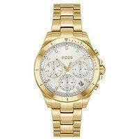 BOSS Ladies Alley Sport Lux Ip Bracelet Watch Size & Fit Available in one size Details Ladies Alley Sport Lux Ip Bracelet Watch - Light Gold by BOSS Gold Ladies BOSS Multifunction watch from the Alley Sport Lux family. Featuring a 36mm stainless steel case, silver white dial with crystal markers, stainless steel bracelet. Water resistant to 5ATM. 24Hr Display: N Case Diameter (in cm): 3.6 Case height (in cm): 1 Case Length (in cm): 3.6 Case Shape: Round Case Width (in cm): 3.6 Fastening Type: Bracelet G... - Manufacturers part number: 1502829
