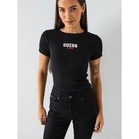 Guess Jeans Gj Short Sleeve Slim Rib Embroidered T-Shirt Size & Fit True to size - order your usual size Regular fit Available in sizes XS - XXL Model is 5'9" and wears a UK size 8 Details Short Sleeve Slim Rib Embroidered T-Shirt by Guess Jeans Black Ribbed fabric Embroidered logo Short sleeves Crew neck Material & Care Material Content: 98%Cotton 2%Elastane