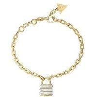Guess 22Mm Pave Padlock Charm Bracelet Steel Crystal White Round Size & Fit Can be worn at 3 different lengths Details 22Mm Pave Padlock Charm Bracelet Steel Crystal White Round by Guess Classic warm gold tone Icy crystal embellishment for a natural sparkle that will turn heads Lobster closure Fashion Jewellery Type: Bracelets Metal Type: Stainless Steel