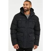 This hooded, puffer style, showerproof jacket by Threadbare features a snap button storm guard over the zip and comes with two deep front pockets along with two zip up chest pockets. This style has a bungee adjusted, microfleece lined hood for extra comfort and features the classic threadbare badge on the sleeve. | Threadbare Men's 'Jackton' Showerproof Hooded Padded Jacket in Black | Size: Small