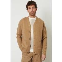 Be comfortable in style in this button down, knitted cardigan from Threadbare. With a V-neckline, ribbed cuffs and hem, this button up cardigan is the perfect addition to your wardrobe. Complete with branded metal tab above the hem, five mock horn buttons and two patch pockets. Made from a super-soft yarn with wool, this style is ideal for layering. Pair with dark denim jeans, a white t-shirt and boots for a stylish, casual look. | Threadbare Men Knitted V-Neck Cardigan in Taupe | Size: Medium