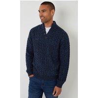 Layering is made simple with this mock t-shirt cable knit jumper from Threadbare. Crafted with a textured cable knit front and jersey stitch sleeves and back, it features a ribbed funnel neck with a mock horn button placket and a mock t-shirt collar. Finished with ribbed cuffs and hem, it combines warmth and style with wool blend comfort. | Threadbare Men Mock Tee Funnel Neck Cable Knit Jumper in Blue | Size: Small