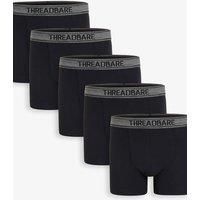 Update your everyday essentials with this five pack of black hipster boxer shorts from Threadbare. Made from a soft cotton and elastane blend for exceptional comfort. 'Threadbare' text is printed on the elasticated waistband. | Threadbare Men 5-Pack Hipster Fit Boxer Shorts in Black | Size: Small