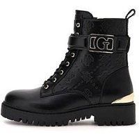 Guess Oranda 4G Peony Logo Combat Boots Size & Fit True to size - order your usual size Standard fit Available in sizes 3 - 8 Heel height: 4cm Crêpe sole height: 2.5cm Leg height: 15.8cm Upper boot circumference: 25cm Details Oranda 4G Peony Logo Combat Boots by Guess Black Faux-leather upper with a classic round toe Lace-up front with side-strap fastening for a locked-in feel Debossed 4G peony logo with logo-script detail on the side, back and sole Laminated insert at the heel for a premium touch... - Manufacturers part number: FLTORA-FAL10 BLACK 36