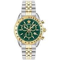 VERSACE CHRONO MASTER Gents watch A new masculine timepiece with a 44 mm case body enriched with a chrono movement and window date at 4h. The green dial is enriched with Versace logomania pattern while the top ring features bold logo and numbers with two tone bracelet 24Hr Display: N Depth: 11.15 MM Height: 44 MM Width: 44 MM Case Diameter (in cm): 4.4 Case height (in cm): 4.4 Case Length (in cm): 4.4 Case Shape: Round Case Width (in cm): 4.4 Fastening Type: Bracelet Glass: Sapphire Movement: Swiss Quar...