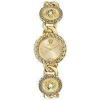 VERSACE La Greca Stud Icon, 28Mm Gold Tone Case, Gold Tone Dial VERSACE LA GRECA STUD ICON, 28MM GOLD TONE CASE, GOLD TONE DIAL 24Hr Display: N Depth: 7 MM Height: 28 MM Width: 28 MM Case Diameter (in cm): 2.8 Case height (in cm): 2.8 Case Length (in cm): 2.8 Case Shape: Round Case Width (in cm): 2.8 Fastening Type: Bracelet Glass: Sapphire Movement: Swiss Quartz (battery) Strap Material: Stainless Steel Water Resistant: Y