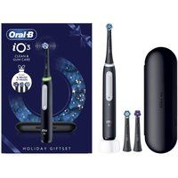 The Oral-B iO3 Night Black Electric Toothbrush is a cutting-edge dental hygiene tool that combines Oral-B's most advanced technology for a professional-grade clean in the comfort of your own home. This seasonal limited edition set also includes a travel case for convenience on the go and 3 refills to ensure consistent cleanliness. Dentist-inspired round brush head with micro-vibrating bristles for superior cleaning Smart Pressure Sensor that helps you maintain optimal brushing pressure Gum Guard that signals when you're brushing with too much force Replaceable brush heads for the best results every 3 months Includes a convenient travel case, 3 refills and 2 pin plug (no adapter). | Oral B iO3 Night Black Electric Toothbrush + Travel Case + 3 Refills in Clear - Manufacturers part number: Oral B_8006530069304