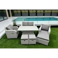 Height Adjustable Table: The multifunctional lifting table adjusts between 68 cm and 48 cm, making it ideal for both dining and casual use. Effortless Maintenance and Comfort: Features plush 8 cm cushions with removable covers for easy cleaning and an ergonomic design for ultimate comfort. Customisable Reclining Comfort: Recliners with adjustable backrests (90 to 130) ensure personalised relaxation for every user. Elegant and Sturdy Construction: Crafted from light grey PE rattan and galvanised steel, w...