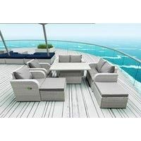 Adjustable Reclining Chairs: Two reclining armchairs with an adjustable backrest (90 to 130) provide personalised comfort for ultimate relaxation. Premium Comfort & Design: Features thick 8cm seat cushions with soft back cushions, an ergonomic high-back design, and a stylish light grey rattan finish with dark grey fabric. Durable & Weather-Resistant: Crafted from handwoven PE rattan with a sturdy galvanised steel frame, a tempered glass tabletop, and removable cushion covers for easy maintenance. Spacio...