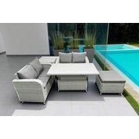 Low Maintenance and Easy Assembly: Delivered flat-packed for straightforward assembly. Lightweight design allows easy movement, and rain covers are recommended for added protection. Versatile Lifting Table: Features a height-adjustable table (68 cm when raised, 48 cm when lowered), offering flexibility for dining or relaxing. Elegant 5-Seater Design: Includes two arc arm loveseat sofas, a side table, a big footstool, and a lifting dining table, perfect for enhancing any outdoor setting. Weather-Resistan...