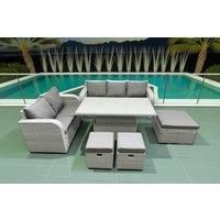 Multi-Functional Rising Table: The 2-in-1 table adjusts between 68cm and 48cm, making it ideal for dining or relaxing with drinks. Elegant & Durable Design: Made from high-quality PE rattan and galvanised steel, this 8-seater set is built to withstand UK weather conditions while adding a stylish touch to your outdoor space. Spacious & Versatile Seating: Includes a love sofa, 3-seater sofa, a large footstool, and two fully assembled stools, providing flexible seating arrangements. Easy Assembly & Reliabl...