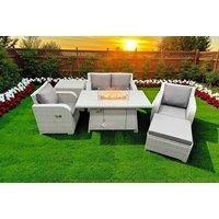 Elegant and Practical Design: This 5-seater slope back garden sofa set includes two reclining chairs, a loveseat, a large footstool, a side table, and a firepit dining table, perfect for outdoor comfort and style. Firepit Dining Table: The 140L x 80W x 69H cm firepit table with a tempered glass top adds warmth and functionality to your outdoor space. Please follow the safety instructions for proper use. Adjustable Reclining Chairs: The reclining chairs feature adjustable backrests (90-130) for personali...