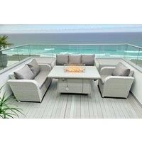 Firepit Dining Table for Warmth: Ideal for all-year outdoor dining and heating. Weather-Resistant & Easy to Maintain: Removable and washable cushion covers. Flat-Packed for Easy Assembly: Clear instructions included for a quick setup. Reclining Chair for Custom Comfort: Adjustable reclining angles for ergonomic relaxation. Premium Handwoven PE Rattan: Built to last with light grey rattan and a strong steel frame.