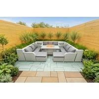Functional Firepit Table: Adds warmth and functionality with clear guidelines for safe gas tank placement. Effortless Cleaning: Includes removable cushion covers and tempered glass for easy maintenance. Spacious 11-Seater Design: Includes 3 three-seater sofas, 2 big footstools, and a firepit dining table, perfect for outdoor entertaining. Comfortable Seating: Features thick 8 cm cushions and ergonomic backrests for a relaxed seating experience. Crafted for Durability: Built with flat PE rattan and galva...
