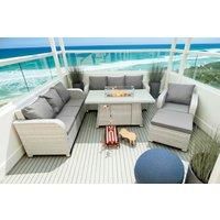 Adjustable Recliner: Reclining chair with back adjustment from 90 to 130 for customised comfort. Spacious Seating: Includes 2 three-seater sofas, a reclining chair, and a big footstool for ample seating options. Durable Materials: Galvanised steel frames and handwoven PE rattan for long-lasting use. Low Maintenance: Removable cushion covers and tempered glass table top for easy cleaning. Firepit Dining Table: Integrated firepit for a warm outdoor dining experience. Ensure safety checks before use.