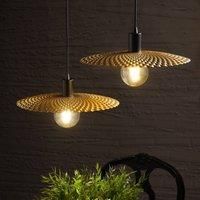 Pendant lamp Piattino with shiny gold shadeThe flat shade of forged metal in a shiny gold design and designed with a beautiful relief pattern, makes the pendant lamp Piattino a highlight above any table. The beautiful look of the lamp is further enhanced and also the pattern of the shade comes into its own even better when a clear lamp with LED filaments is chosen as the light source.
