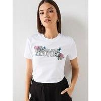 Versace Jeans Couture Logo Roses T-Shirt Size & Fit True to size - order your usual size Regular fit Available in sizes XS - XL Details Logo Roses T-Shirt by Versace Jeans Couture White Logo print with roses Short sleeves Crew neck Material & Care Material Content: TESSUTO 1:95% CO 5% EA - - Manufacturers part number: WQH5J