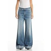 Replay Nalaja Wide Leg Jeans Size & Fit True to size - order your usual size Wide leg Low-rise waist Available in sizes 23 - 33 Details Nalaja Wide Leg Jeans by Replay Blue Wide-leg style offering a comfortable and relaxed fit Pressed pleat on the front Zip and button fastening 5-pocket piece Rigid cotton denim Gull-wing stitching to the back pockets Front pockets features a small branded insert Statement turn-up hem Material & Care Material Content: 100%Cotton; Washing Instructions: Machine Washable Ge...
