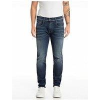 Replay Anbass Slim Fit Jeans Size & Fit True to size - order your usual size Slim fit Available in sizes 30 - 38 Model is 6'2"" and wears a size Medium (M) Details Anbass Slim Fit Jeans by Replay Blue Distressed wash Mid rise Belt loops Button front Five pocket styling Rear waistband tab Material & Care Washing Instructions: Machine Washable - Manufacturers part number: M914E .000.661 604