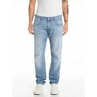 Replay Rocco Comfort Straight Fit Jeans- Dark Blue Size & Fit True to size - order your usual size Straight fit Available in sizes 30 - 38 Details Rocco Comfort Straight Fit Jeans by Replay Dark Blue Distressed detail Mid rise Belt loops Button front Five pocket styling Rear waistband tab Logo to back pocket Washing Instructions: Machine Washable