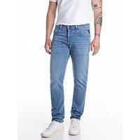 Replay Grover Touch Slim Straight Fit Jeans Size & Fit True to size - order your usual size Slim fit Available in sizes 30 - 38 Model is 6'2"" and wears a size Medium (M) Details Grover Touch Slim Straight Fit Jeans by Replay Blue Distressed wash Mid rise Belt loops Button front fastening Five pocket styling Rear waistband tab Embroidered logo to back pocket