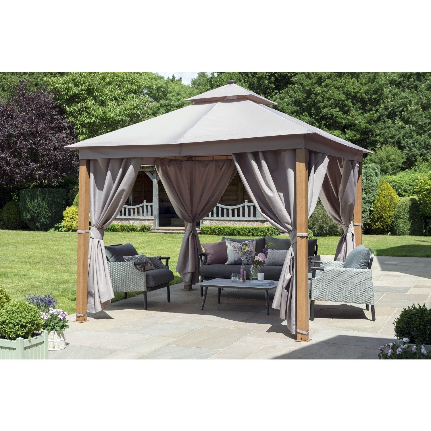 Dimensions H268cm x W300cm x D300cmThe ultimate garden gazebo with a wood look painted aluminium frame polyester side wall and a vented roof. The 3x3m gazebo also included an LED interior centre light and strip lights on the roof ribs. Features . 3m x 3m gives this gazebo lots of coverageStrong and sturdy structureWood look painted aluminium frameVented roof with LED centre light and strip lights on the centreStylish contrasting designAssembly required. .