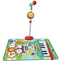 Playmat 3 in 1. Microphone with stand. Line input connection. Playmat with Drum set with 4 drums, cymbal and drumsticks. Piano-Playmat with 4 instrumental sounds and 6 demo melodies. Specifications: Dimensions: H:60.0 x W:82.0 x D:59.0 cm Guarantee:1Y Material: Plastic Model Number: 2727