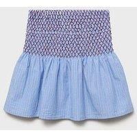Mango Girls Alicia Stripe Co-Ord Skirt Size & Fit True to size - order your usual size Available in sizes 5-6 years - 13-14 years Details Girls Alicia Stripe Co-Ord Skirt by Mango Blue Striped print Shirred waistband Pull on Mid rise Material & Care Material Content: Composition: 84% Cotton, 13% Polyester, 3% Elastane Lining: 100% Cotton Washing Instructions: Machine Washable Matching blouse available under WNYAU - Manufacturers part number: WO2Y6