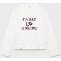 Mango Girls Music Long Sleeve T-Shirt Size & Fit Regular fit Available in sizes 5-6 years - 13-14 years Details Girls Music Long Sleeve T-Shirt by Mango Light Cream Graphic print Long sleeves Crew neckline Frilled hem Material & Care Material Content: Composition: 100% Cotton Washing Instructions: Machine Washable