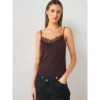 Mango Knitted Lace Cami Top Size & Fit True to size - order your usual size Regular fit Available in sizes XS - L (XS:UK 6, S:UK 8, M:UK 10, L:UK 12) Model is 5'10" and wears a UK size 8 Details Lace Trim Vest by Mango Brown V neck with lace trim Sleeveless Adjustable length slim straps - Manufacturers part number: WTI2G
