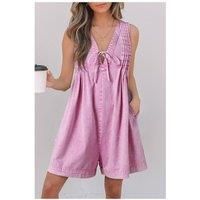 The Bonbon Mineral Wash Pleated Bust V Neck Sleeveless Denim Romper is a chic and trendy addition to your wardrobe. Featuring a pleated design at the bust this A-line romper has a sexy eye-catching V-neck with a tie. The mineral wash gives it a modern look while the sleeveless and wide leg design ensure its both cool and flattering. | Everyday The Label Women's Bonbon Mineral Wash Pleated Bust V Neck Sleeveless Denim Romper in Bright Pink | Size: XL