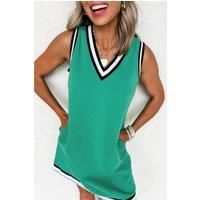 This Mint Green Color Contrast Trim V Neck Shift Sleeveless Mini Dress is a stylish and versatile addition to your wardrobe. The contrast striped trim adds a touch of varsity fashion making it a trendy choice for various occasions. The shift mini dress design is flattering for different body shapes and the sleeveless design ensures you stay cool and comfortable during hot summer days. Crafted from a soft and breathable cotton blend this tank dress offers both comfort and style. | Everyday The Label Wome...