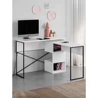 Upgrade your workspace with this stylish flat-pack work desk, featuring a moveable nesting side table for added versatility. Made from durable 18mm engineered wood with sturdy black metal legs, it includes 3 open storage shelves to keep essentials organized. Measuring 110cm W x 37.2cm D x 77cm H, it fits various spaces while offering a spacious work surface. Available in white, retro grey, and oak, this desk blends function and style for a modern home office. Features: Versatile Design: This Nesting Wor...