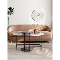 Decortie Cuddle Set Of 2 Coffee Tables - Marble/grey Introducing our versatile nested coffee table set, perfect for any space. This set includes a mobile round table with wheels and an elegant oval table, both crafted from high-quality 18mm engineered wood. Use them together or separately as needed. Available in 5 stunning colours, they add a modern touch and sturdy support with sleek metal legs. Easy to assemble, these tables are ideal for living rooms and offices. Secure packaging ensures they arrive ...