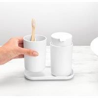 Brabantia White 3-piece Bathroom Accessory Set Bathroom set consisting of soap dispenser, toothbrush holder and tray Depth: 97 MM Height: 148 MM Material Content: plastic Width: 168 MM Adjustable: N set of 3 matching accessories, consisting of soap dispenser, toothbrush holder and tray Tray can be used as a coaster, soap dish or storage tray Easy to refill soap dispenser holds upt 250ml of soap and will not drip Stand stable - non skid base Easy to clean toothbrush holder, removable insert for tradition... - Manufacturers part numbers: 280382|30857652