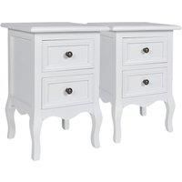 This set of two vintage style nightstands comes with full-sized drawers so that your bedside essentials will never be far from reach.Each piece has two drawers. Its clear lacquered real wood drawer sides make this nightstand even more elegant. It also features tapered cabinet legs and brushed nickel knobs. It is finished in durable white MDF. This listing is for a set of 2 nightstands packed in one carton. Note: Since this furniture is hand-crafted, made of wood and painted white, it may come with a sma...