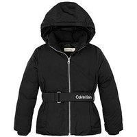 Calvin Klein Jeans Girls Short Padded Jacket Size & Fit True to size - order your usual size Regular fit Available in sizes 8 years - 16 years Details Girls Short Padded Jacket by Calvin Klein Jeans Black Hooded Long sleeves Zip up fastening Belted Material & Care Material Content: 100% Polyamide Washing Instructions: Machine Washable