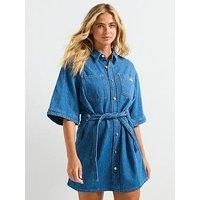 Calvin Klein Jeans Denim Mini Shirt Dress Size & Fit True to size - order your usual size Regular fit Mini length Available in sizes XS - XXXL Model is 5'7" and wears a UK size 8 Details Denim Mini Shirt Dress by Calvin Klein Jeans Blue Shirt dress with collar Half sleeves Belt loops with tie belt Button through fastening Patch pockets on chest Material & Care Material Content: 80% Cotton, 20% Linen Washing Instructions: Machine Washable