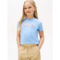 Tommy Hilfiger Girls Script Sequins Short Sleeve T-Shirt Size & Fit Regular fit Available in sizes 4 years - 16 years Details Girls Script Sequins Short Sleeve T-Shirt by Tommy Hilfiger Blue Short sleeves Crew neck Sequinned logo design Material & Care Material Content: 100% Cotton Washing Instructions: Machine Washable