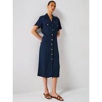 Tommy Hilfiger Short Sleeve Shirt Dress Size & Fit Regular fit Midi length Available in sizes 34 - 46 (EU 34:UK 6, EU 36:UK 8, EU 38:UK 10, EU 40:UK 12, EU 42:UK 14, EU 44:UK 16, EU 46:UK 18) Details Short Sleeve Shirt Dress by Tommy Hilfiger Navy Short sleeves Shirt dress with classic collar Button through fastening Front buttoned cargo pockets Gold coloured buttons Material & Care Material Content: 100% Viscose Washing Instructions: Machine Washable
