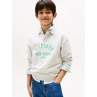 Tommy Hilfiger Boys Graphic Sweat Size & Fit Regular fit Available in sizes 4 years - 16 years Details Boys Graphic Sweatshirt by Tommy Hilfiger Grey Applique logo Long sleeves Polo collar Button fastening Material & Care Material Content: 100% Cotton Washing Instructions: Machine Washable
