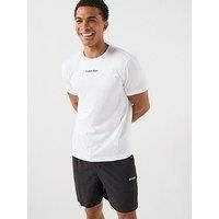 Calvin Klein Sport Ck Icon Short Sleeve Performance T-Shirt Size & Fit True to size - order your usual size Regular fit Available in sizes S - 2XL Model is 6'3" and wears a size Medium (M) Details Ck Icon Short Sleeve Performance T-Shirt by Calvin Klein Sport White Logo print on front Crew neck Short sleeves Material & Care Material Content: 92% Polyester 8% Elastane Washing Instructions: Machine Washable