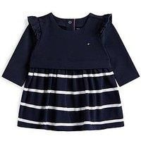 Tommy Hilfiger Baby Girls Essential Long Sleeve Knitted Dress Size & Fit Available in sizes 0-3 months - 18-24 months Details Baby Girls Essential Long Sleeve Knitted Dress by Tommy Hilfiger Navy Crew neck Long sleeves Frill shoulders Popper fastening on back Striped Small logo Material & Care Material Content: 95% Organic Cotton, 5% Elastane Washing Instructions: Machine Washable