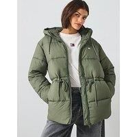 Tommy Jeans Hooded Puffer Jacket Size & Fit True to size - order your usual size Regular fit Length sits just past the hips Available in sizes XS - XL Model is 5'9" and wears a UK size 8 Details Hooded Puffer Jacket by Tommy Jeans Green Padded Non-removable hood with drawcord adjustment Zip closure Two side pockets Long sleeves with stretch cuffs Toggle cord drawstring cinches the waist Tommy badge on chest Material & Care Material Content: Nylon/polyamide (100%)
