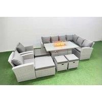 Comfortable Seating: Ergonomic high-back design for ultimate relaxation. Stylish Design: Light grey mixed rattan with dark grey fabric for a modern look. Easy Assembly: Comes flat packed with straightforward instructions. Durable Construction: Galvanized steel frames with powder coating resist rust. Weather Resistant: Designed to withstand the elements for long-lasting use. Versatile Setup: Includes 3-seater sofa, footstools, chairs, and dining table. Fire Pit Table: Integrated fire pit adds warmth and ...