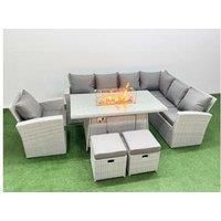 Quick Assembly: Simple setup with included instructions. Durable Galvanised Frame: Powder-coated steel resists rust and weather. Plush Comfort: Ergonomic high-back seats with thick, removable cushions. Integrated Fire Pit Table: Adds warmth and ambience for year-round use. Low Maintenance: Removable, washable cushion covers for easy care. Spacious Seating: Seats up to nine with two handy footstools. Modern Rattan Style: Light grey mixed rattan and dark grey fabric suit any garden. Weather Resistant: Bui...