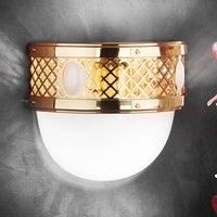 Art Nouveau wall lamp Alt Wien made of solid brass and glass As the name suggests, the wall lamp Alt Wien is a tribute to past times, namely the Art Nouveau. The flair of the turn of the century can be easily brought into your own four walls or into public rooms with this wall lamp. Especially representative is the wall lamp by the diamond-shaped pattern and the oval decorative stones on the brass rim. The opal hemispherical glass ensures a glare-free light distribution and creates pleasant lighting con...